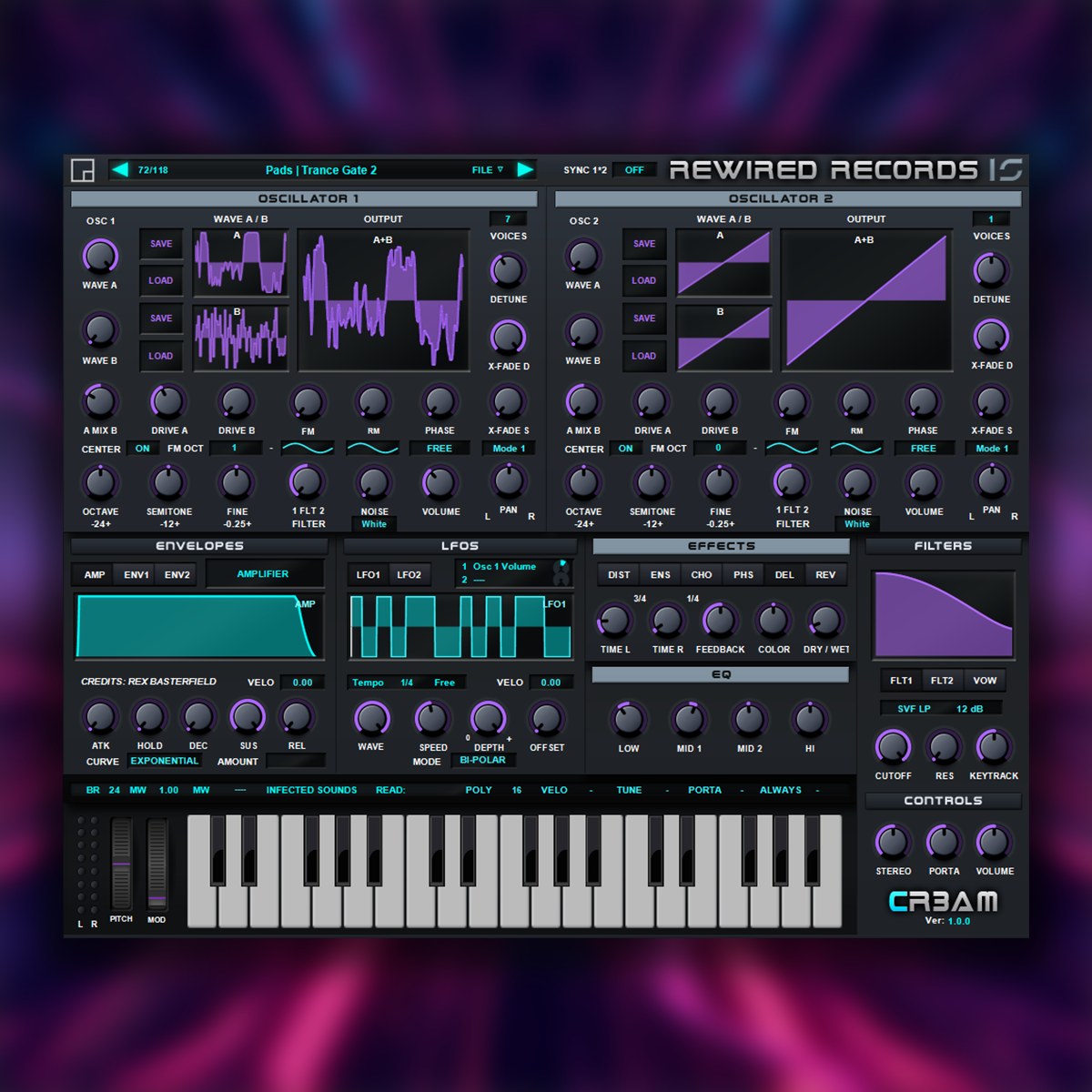 • 2 Mod Envelopes and 2 Mod LFO's (with 33 LFO shapes)